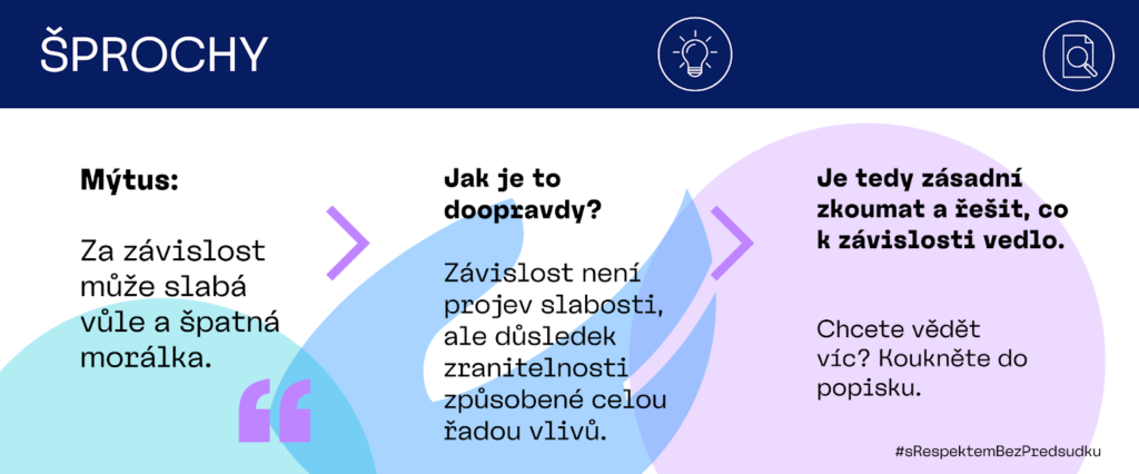 Společnost Podané ruce v rámci svého projektu upozorňuje na nejčastější mýty o závislostech, například že závislost je důsledkem slabé vůle, morálky nebo nízkého socioekonomického statusu. Projekt ukazuje, že závislost je důsledkem zranitelnosti – ať už vrozené, životními okolnostmi, traumatem nebo stresem. Důležitá je podpora a harm reduction, tedy opatření, která minimalizují negativní dopady užívání látek a pomáhají lidem bezpečně řešit jejich situaci.